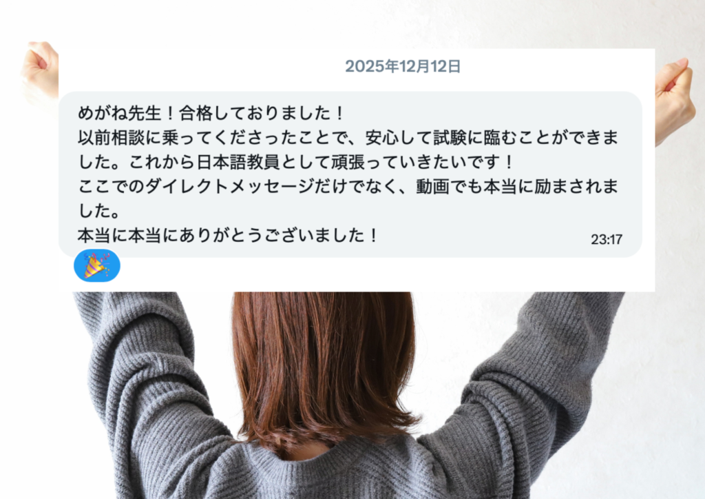 以前、相談に乗ってくださったことで、安心して試験に臨むことができました。これから日本語教師として頑張っていきたいです!