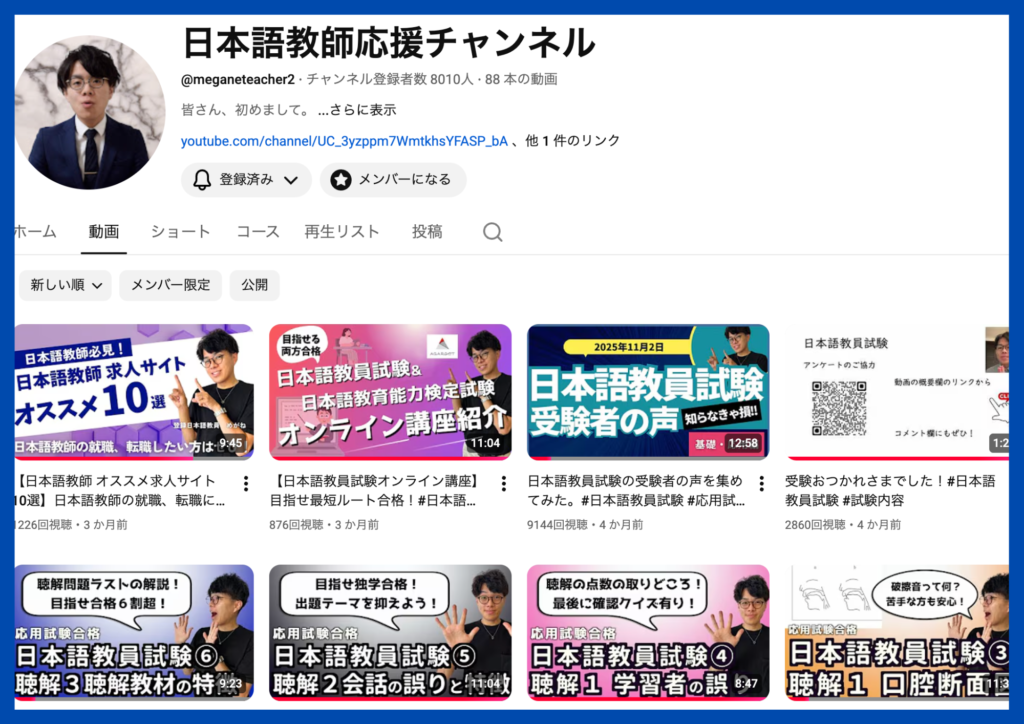 YouTubeの総フォロワー数は3万人を超えており、世界中の日本語学習者が動画を通して日本語を学んでいます。日本語教師を目指す人への試験対策講座やキャリア構築に対するアドバイスなども実施しています。