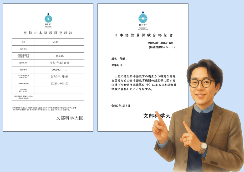 運営者の資格としては、大学院で日本語教育の主専攻修了、日本語教育能力検定試験合格、そして国家資格である登録日本語教員を取得済です。